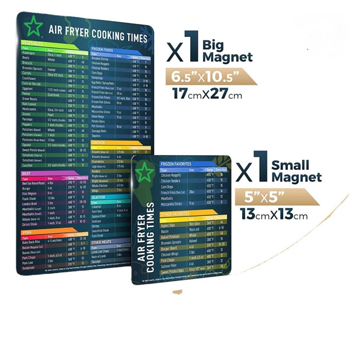 1.Each pack comes with 2 cooking time cheat sheets for air fryers that show the Cooking Time, Temperature, and Size of food to take the guesswork out of cooking, so you don’t have to waste time looking things up. LARGER font is printed on the small magnet with your most popular Frozen Foods for even e