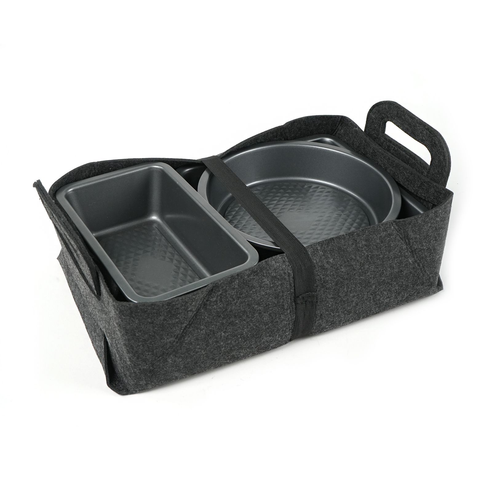 All pieces of our baking set were designed to fit neatly into one another, saving you valuable space in your kitchen cabinets. Utilize the felt storage organizers to keep your bakeware neatly arranged, preventing scratches.